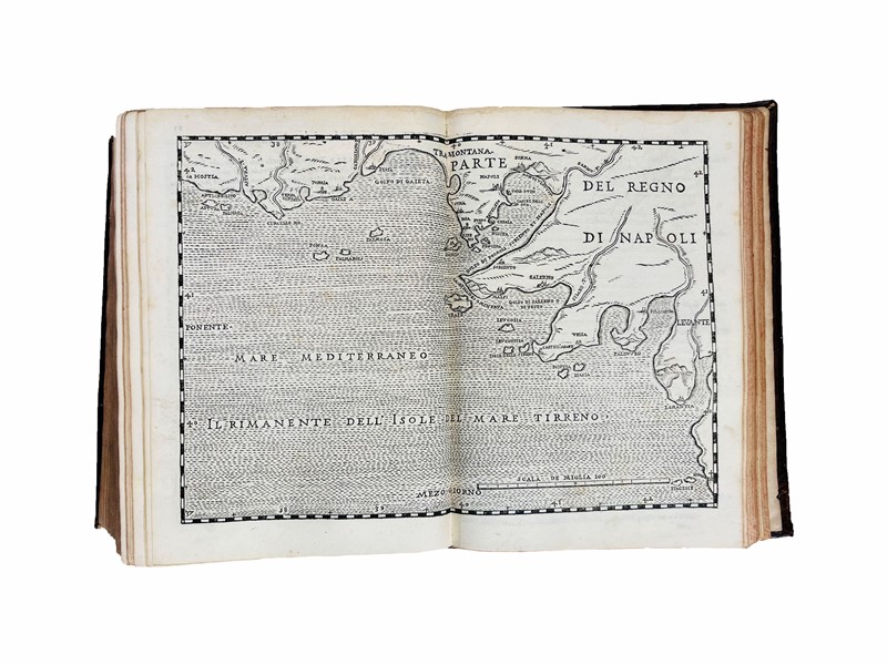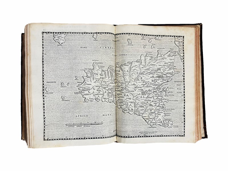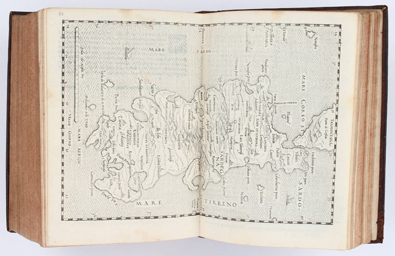 Rara edizione figurata. L’opera, in questa edizione accresciuta con l’aggiunta delle "Isole", costituisce una importante raccolta di materiale e sarà particolarmente utilizzata nello sviluppo successivo della scienza geografica e geopolitica. Le carte geografiche rappresentano Corsica, Sardegna, Sicilia, isole Tremiti, arcipelago toscano, arcipelago pontino e isole del golfo di Napoli. In fine bella veduta a volo d'uccello di Venezia considerata come un'isola. La carta della Corsica è una delle prime stampate. Solo le edizioni del 1567 e la presente presentano la sezione cartografica, che viene proposta nel mercato anche separatamente.