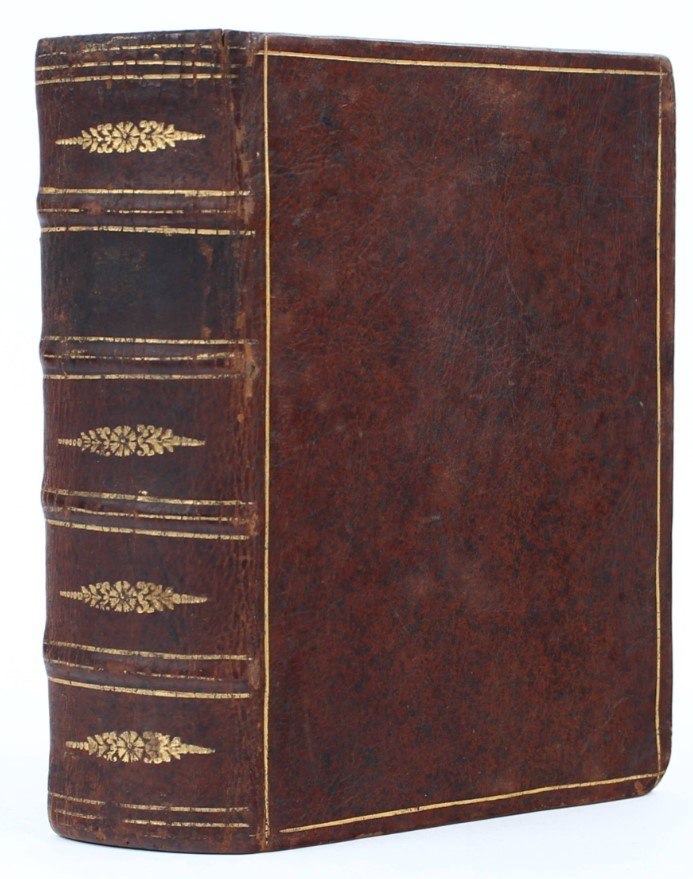 4to, 198x145 mm. Legatura piena pelle del ‘700. Carte 34 nn., 495 num, 1 c. bianca; 100 num., 5 nn di index. 7 carte di tavola a doppia pagina. Doppio frontespizio con marca tipografica incisa, capolettera xilografati. Ex libris araldico “Fechenbach” incollato al contropiatto. Monogramma di precedente proprietario sul Frontespizio. Lievi abrasioni alla legatura, internamente alcune bruniture e tracce d’uso, buon esemplare.