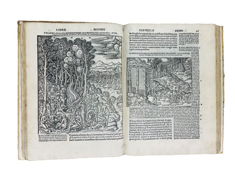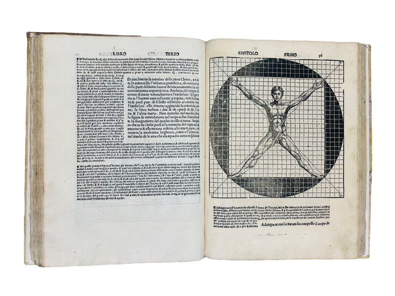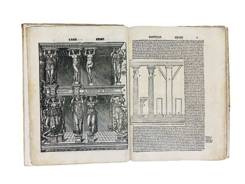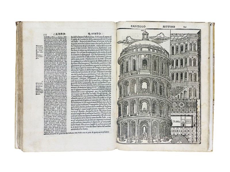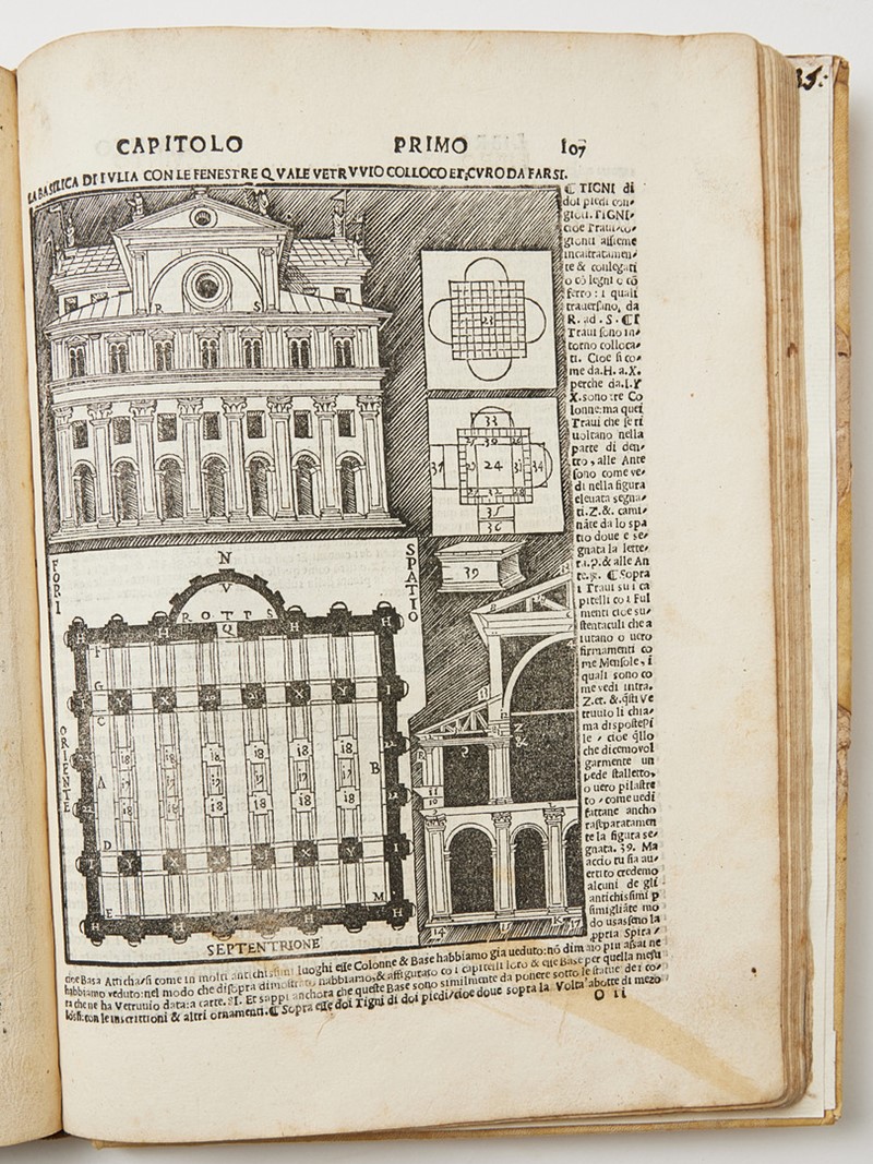 4to. 300 x 225 mm. Later vellum, renewed endpapers. Leaves (3, including the title page), 131. 71 lines plus headline. Text in Roman type framed within a commentary in smaller types and Greek type. Historiated initials, a large Q with a perspective view of buildings. Woodcut architectural title page with portrait and coat of arms of the translator in the border, dedication sheet with full-length woodcut portrait of Giano Bigazzini, 81 woodcut illustrations, some full-page. Traces of wear on the binding, slightly stained, heavier in some places (also affecting the woodcut title page and 1 full-page woodcut), some water stains, especially at the beginning.