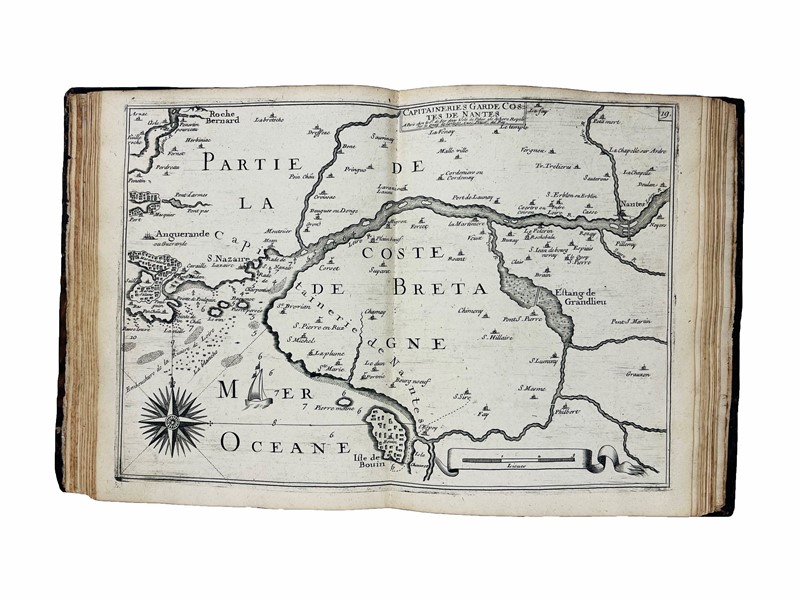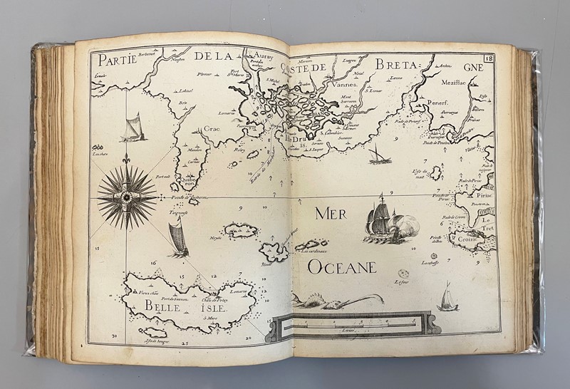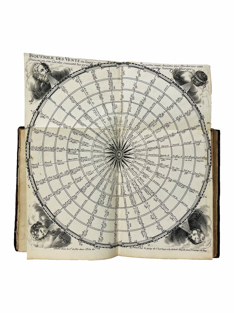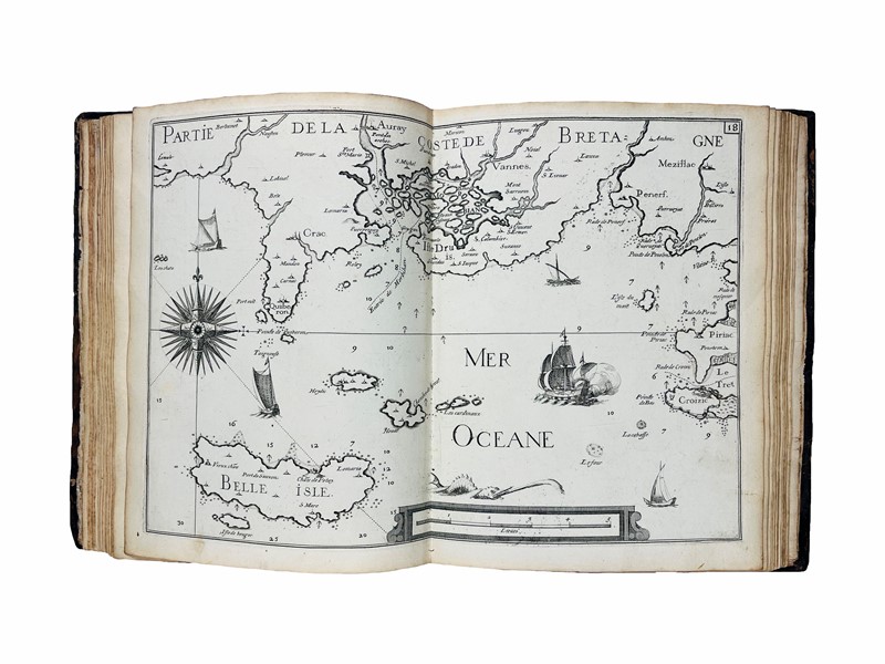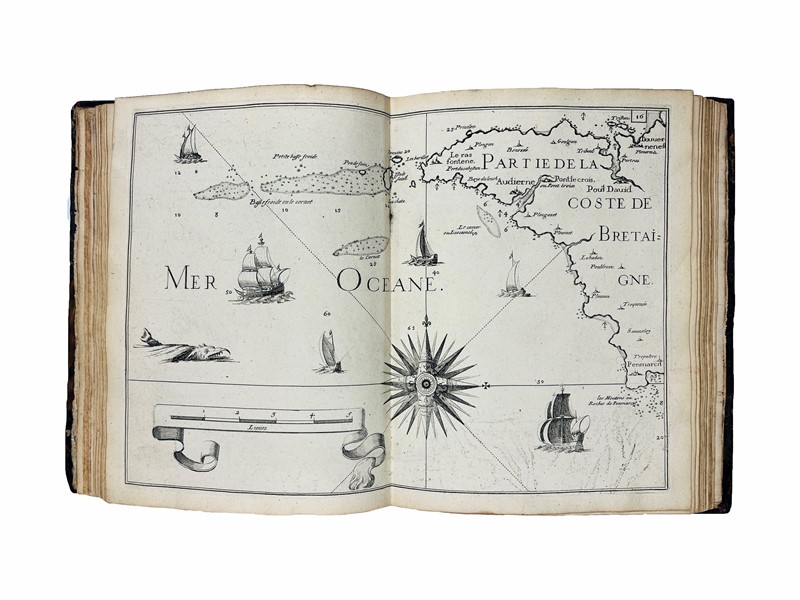 Due parti in un volume in-4to. Legatura coeva in pelle bruna, dorso a nervi. Frontespizio figurato inciso su doppia pagina. Altro Frontespizio inciso per la seconda parte. Pagine [4], 38, [2], 60. 32 Carte con le coste, incluse una carta dei Venti ripiegata e una carta con l’indice generale della Francia, tutte incise in rame. Buon esemplare.