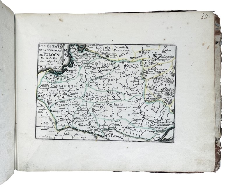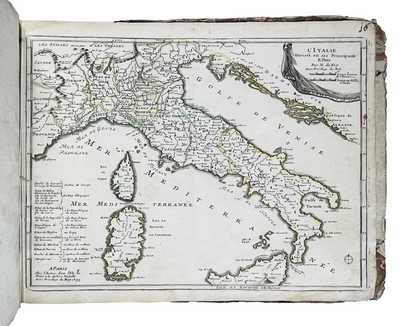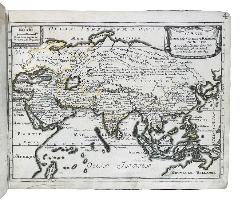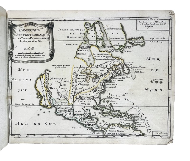 Rare first edition. The maps are engraved by C. Inselin, Jean Baptiste Liebaux and H. v. Loon. The atlas consists of an illustrated Titlepage, with the armillary sphere in the centre, drawn and engraved by N. Guerard, 19 engraved double page sheets maps, all hand-colored in outline, dated 1692-97, including a general map of the World and Continents, accompanied by engraved descriptive text throughout, by Pierre Duval. Unlike the more common Atlas Curieux with a single map of the Western Hemisphere, de Fer's Petit et Nouveau Atlas contains separate maps of North America and South America. The map of North America, dated 1693, shows California as an Island with an indented northern coast and no place names, but labeled Isle de Californie. The work had considerable resonance and was republished in 1705 and 1723.