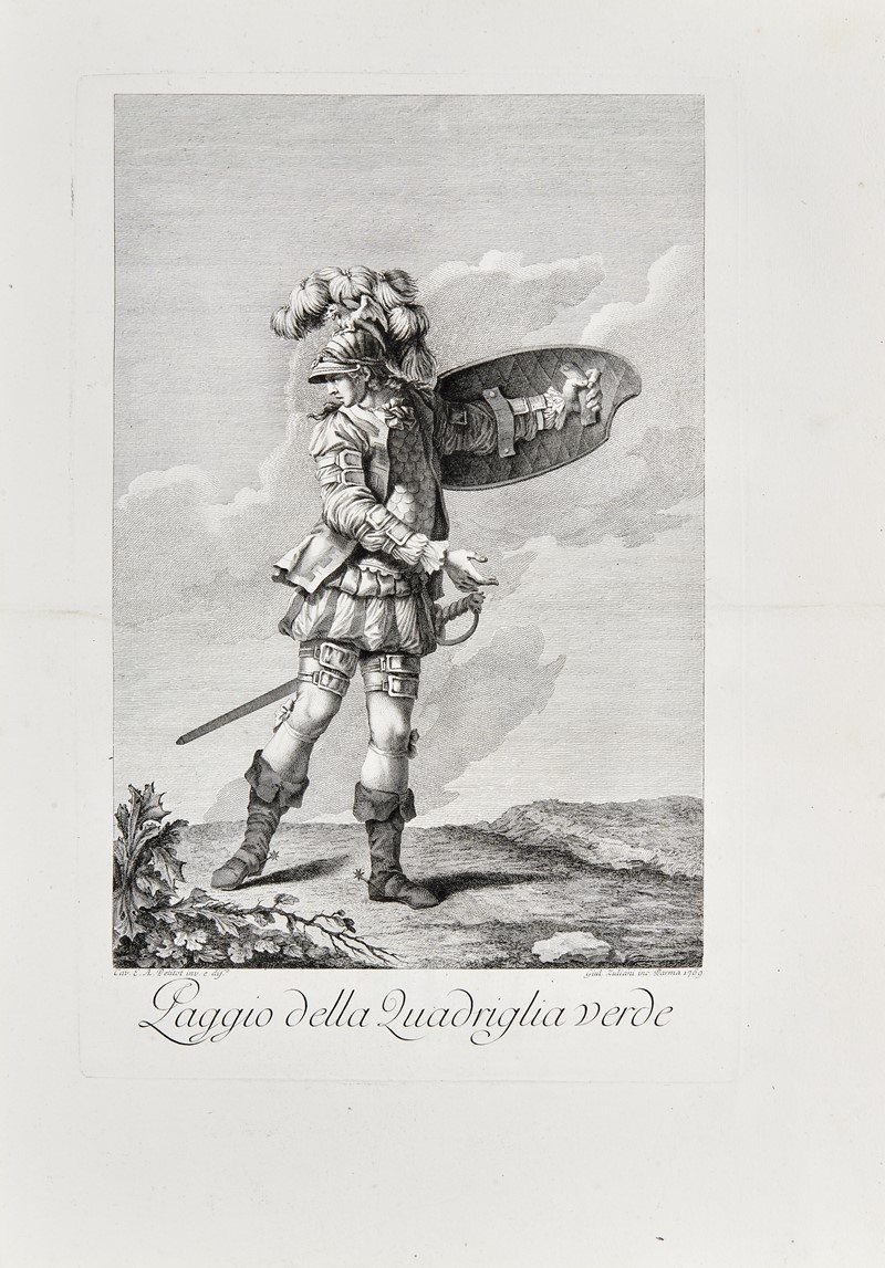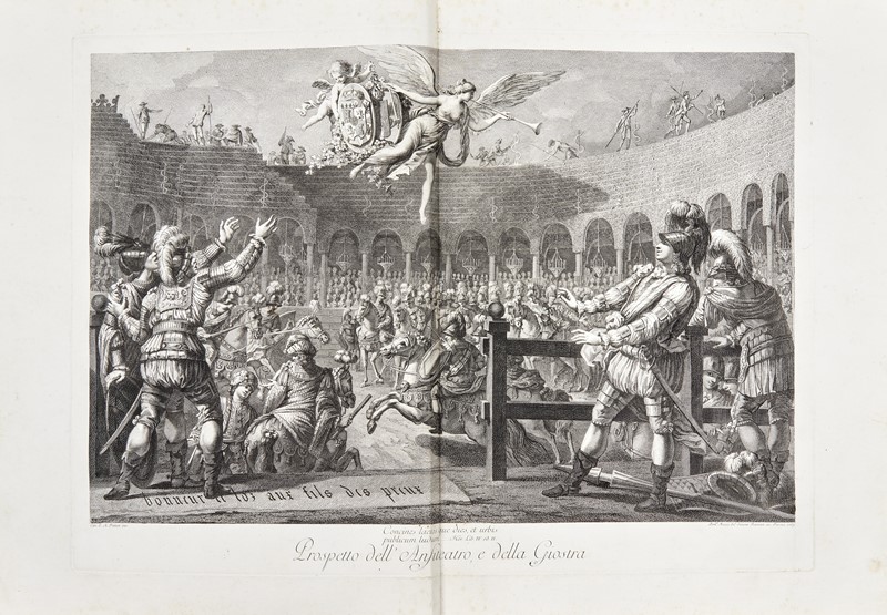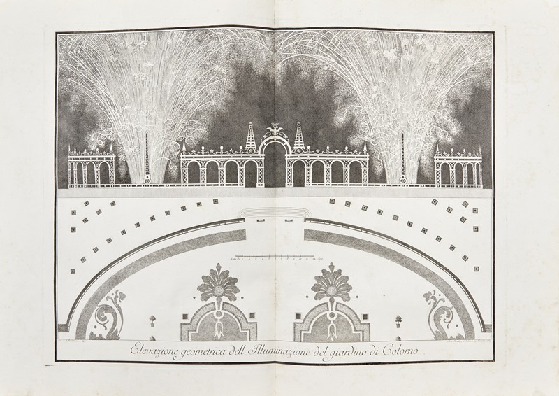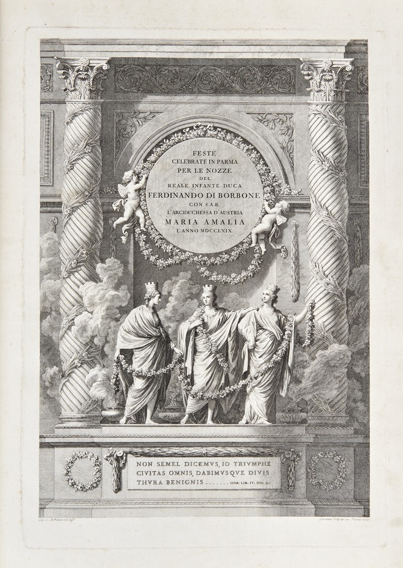 Uno dei più straordinari libri pubblicati da Bodoni e realizzato agli albori della sua carriera in collaborazione con Ennemond Alexandre Petitot (1727-1801), primo architetto della corte di Parma dal 1753. Questa grandiosa e celebre opera descrive attraverso uno spettacolare corredo iconografico gli spettacoli allestiti in occasione delle nozze tra Ferdinando I di Borbone e Maria Amalia d'Asburgo-Lorena nel 1769, per le quali Petitot aveva ideato progetti architettonici, scenografie e costumi, qui magistralmente riprodotti all'acquaforte da Benigno Bossi ed altri maestri dell'epoca. L'elegante impaginazione di Bodoni fa da corredo alle spettacolari incisioni e il libro ebbe un successo enorme.