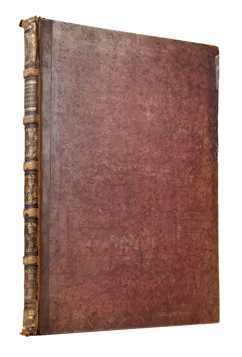 Folio. 537 x 393mm. Legatura in mezza pelle, piatti in carta marmorizzata. Pagine. [8], 76. 37 c. di tav. Occhietto, frontespizio allegorico, frontespizio tipografico alle armi dei Borbone con leoni di Spagna e trofei militari, 76 pagine di testo su due colonne in italiano e francese, 5 testate, 8 iniziali, 19 finalini e 36 tavole di cui 6 a doppia pagina. Buon esemplare.