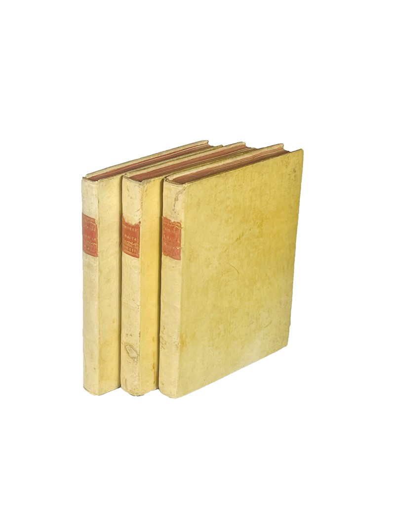 Three volumes in 4to; 277x203 mm. Contemporary full stiff vellum binding, red edges, titles on labels on spines. Pp. (12), XL, (4), 215, (1); (10), 225; (8), 249, (1). 3 plates o.t., 21 engraved headpieces and 6 engraved tailpieces in the text. Vignettes on the three titlepages. Nice specimen within a modern box.