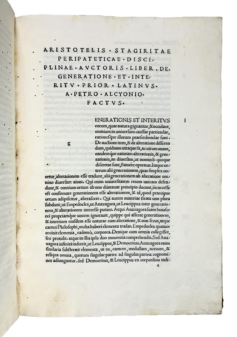 Edizione originale della traduzione di Pietro Alcionio. L’umanista P. Alcionio, 1487-1527, dopo aver studiato greco a Venezia, sotto la guida di Marco Musuro da Candia, si impegnò come correttore di bozze presso l'editore e tipografo Aldo Manuzio. Nel 1521 pubblicò questa traduzione latina dei vari testi di Aristotele, dedicando l'opera a Leone X. Oltre al “De generatione et corruptione”, il volume comprende le opere “Meteorologica”, “De mundo” e “Parva naturalia”. Il De mundo è opera di attribuzione incerta.
