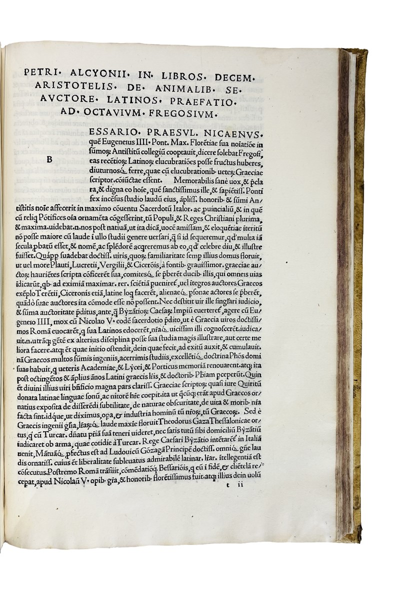 ARISTOTELES - ALCIONIO, Pietro. Habes hoc in codice lector Aristotelis libros De generatione & interitu duos: Meteóron, hoc est sublimium quatuor: De mundo … Quae Omnia Petrus Alcyonius de greco in latinum a se conversa nuc primum ex impressione repraesentanda curavit.