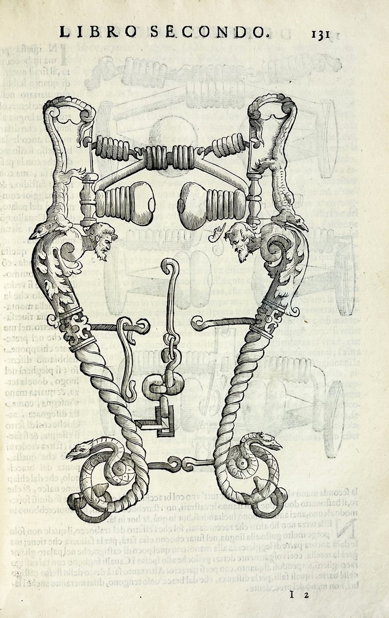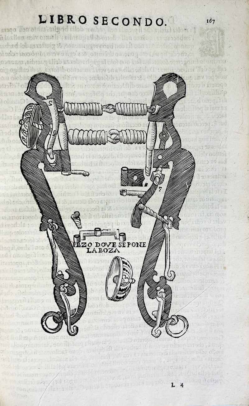 2 parti in un volume in-folio. 320x220 mm. Legatura coeva piena pergamena rigida, titolo in oro su tassello al dorso. Frontespizio, pagine 118, [2], 256, compreso secondo Frontespizio. Grande vignetta incisa in rame al Frontespizio ‘La Minerva’, Iniziali xilografiche, 140 figure in legno, molte a piena pagina, grande marca tipografica di Francesco Prati in fine con data 1620. Fogli di guardia rinnovati, alcune pagine con bruniture e foxing, nella seconda parte piccolo restauro all’angolo superiore di pagina 125 e nella pagina 229.