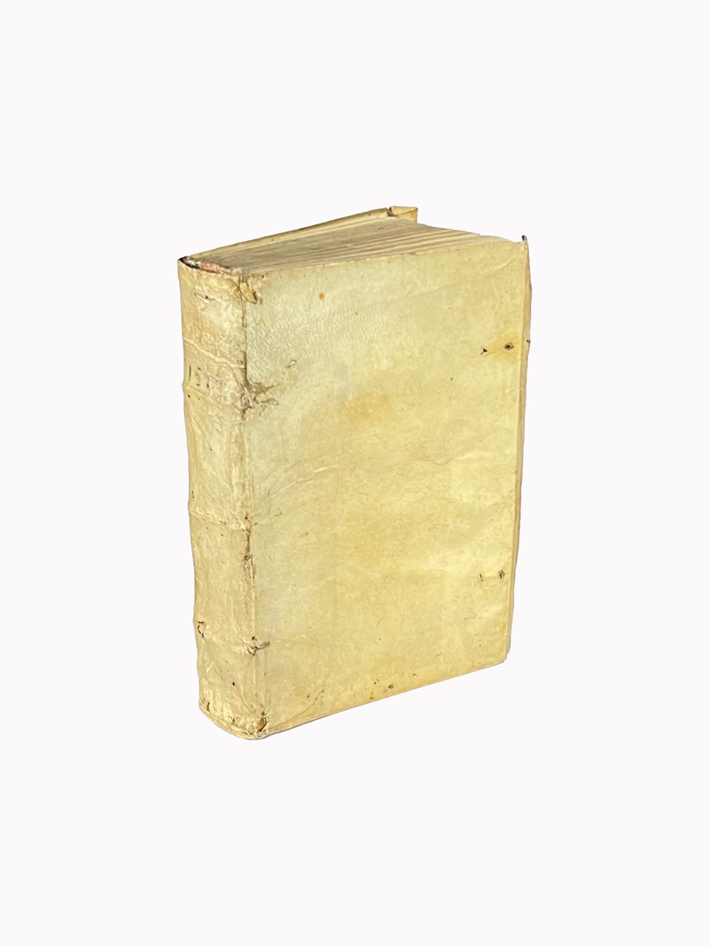 8vo, 210x130 mm. Legatura in piena pergamena molle con unghie. Tracce di lacci. Cc. [14] 299 [3]. Ancora aldina al titolo e all'ultima pagina. Spazi per capilettera con lettere guida. La carta p4 è bianca. Alcuni errori di numerazione. Abile restauro al margine bianco del frontespizio. Due pagine finali bianche con annotazioni manoscritte in inchiostro nero e bruno. Leggera velatura d’umidità al margine delle carte. Buon esemplare marginoso.