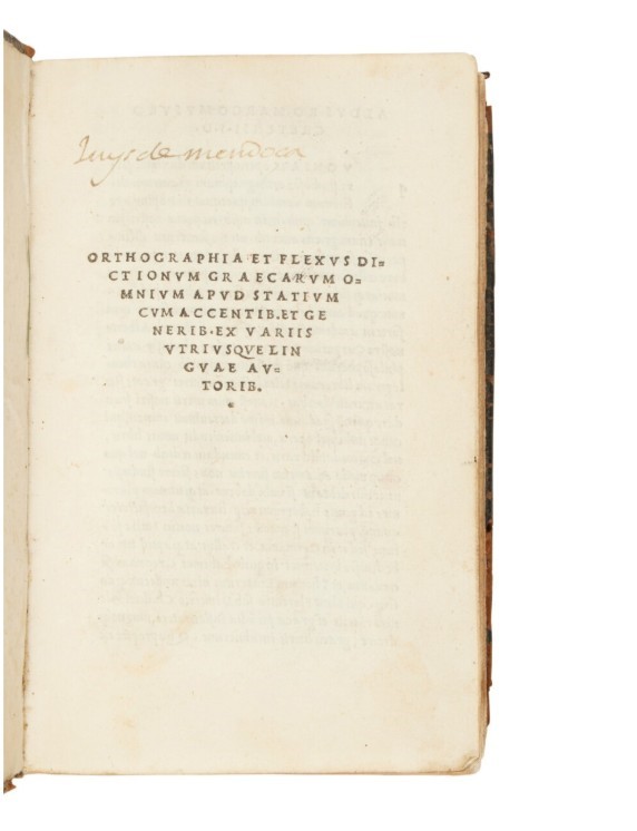 First Aldine edition, complete copy of the Orthography part. Very rare first issue, recognizable by an error at the colophon: "cautum est et in hoc" instead of "cautum est in hoc".