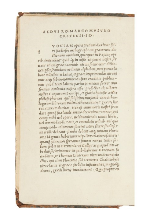 Aldus's Orthographia, with a dedication to the humanist Marcus Musurus, lists in alphabetical order all the Greek loans used by Statius, providing Greek synonyms and Latin meanings.