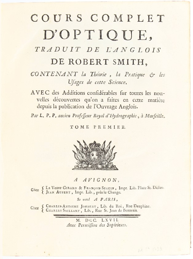 SMITH, Robert. Cours complet d'optique [...] contenant la Théorie, la Pratique & les Usages de cette Science Avec des Additions considérables sur toutes les nouvelles découvertes qu'on a faites en cette matière depuis la publication de l'Ouvrage Anglois.