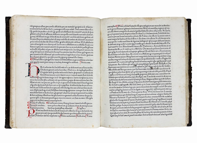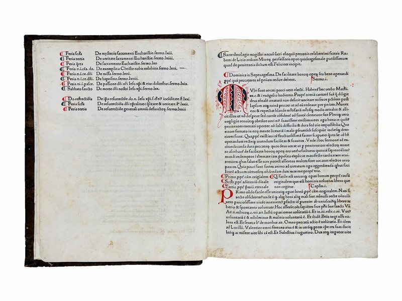In-folio piccolo. 238x187 mm. Legatura del XVIII secolo in mezza pelle marezzata, dorso liscio con doppio tassello arancione e blu e con decorazioni dorate, piatti marmorizzati. Carte 270 non numerate. Titolo nell'incipit a c. [3]r: “Sacre theologie magistri necnon sacri eloquii preconis celeberrimi fratris Roberti de Litio... opus quadragesimale perutilissimum quod de penitentia dictum est ...”. Colophon a c. [270v]: “[Venezia]: Hailbrun alemanus Franciscus formis Veneta me pressit in urbe, 1472”. Carattere Romano, Spazi riservati per iniziali. Bella iniziale miniata in rosso e blu all'incipit, altre iniziali miniate in rosso e in blu, e numerosi capilettera e segni di paragrafo in rosso. Marginalia e annotazioni di mano antica. Tracce d’uso, alone alle carte [90-92], restauro all’ultima carta.