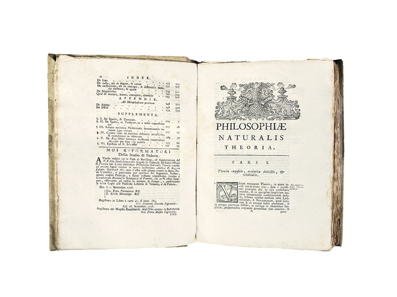 Rare edition of Boscovich's seminal work, a precursor to modern atomic theory. Riccardi: “In questa opera Boscovich considera l’attrazione universale di tutte le forze fisiche" Norman: "Boskovich's theory influenced the position of nineteenth-century field physics with regard to the relations between space and matter; it was employed by Faraday and Kelvin, and J. J. Thomson used its curve of forces to introduce the earliest concepts of atomic physics." The book proposes a unified theory of the forces governing the universe, describing matter as a combination of fundamental particles and their interactions through a universal force law. This had a significant impact on subsequent physics and philosophy of science, leading to atomic theory and influencing scientists such as John Dalton and Michael Faraday.