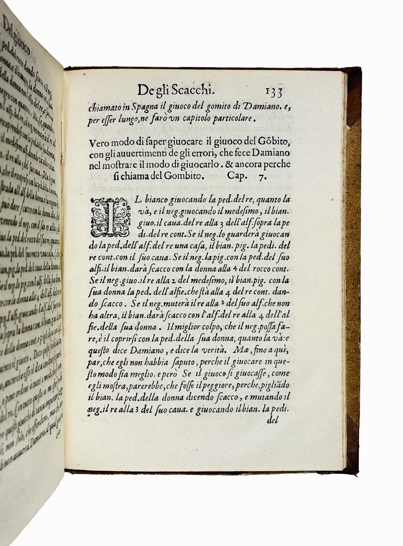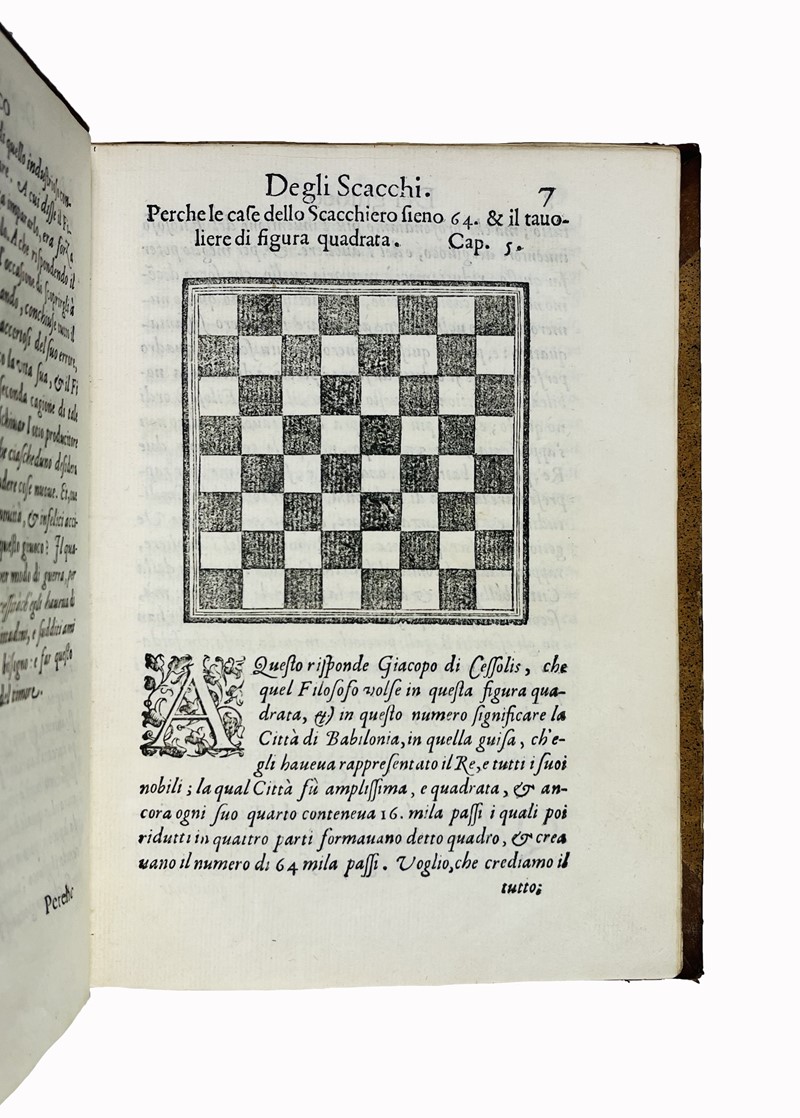 In-4to, 202x142 mm. Legatura mezza pelle con angoli, tassello e titoli al dorso. Pp. (8), 214, (2). Marca tipografica al frontespizio con piccolo ex libris coevo manoscritto. Scacchiera incisa in legno alla carta A4r e altre sei incisioni xilografiche raffiguranti i pezzi degli scacchi; capilettera ornati e figurati nel testo. Fresco e bell’esemplare.