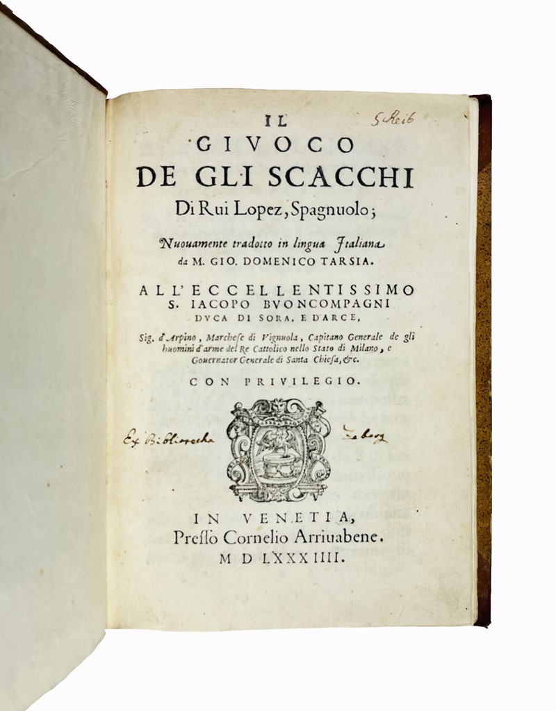 Rarissima Prima edizione in prima tiratura con gli errori a pagina 133 “gomito gobito e gombito” di questo fondamentale trattato sugli scacchi del monaco spagnolo Ruy Lopez de Segura, consigliere di Filippo II, pubblicato originariamente ad Alcalà nel 1561. Nel manuale tecnico l'autore narra l'origine degli scacchi, spiega le regole del gioco che coincidono quasi totalmente con quelle odierne, e fornisce per la prima volta un quadro completo delle aperture allora note.