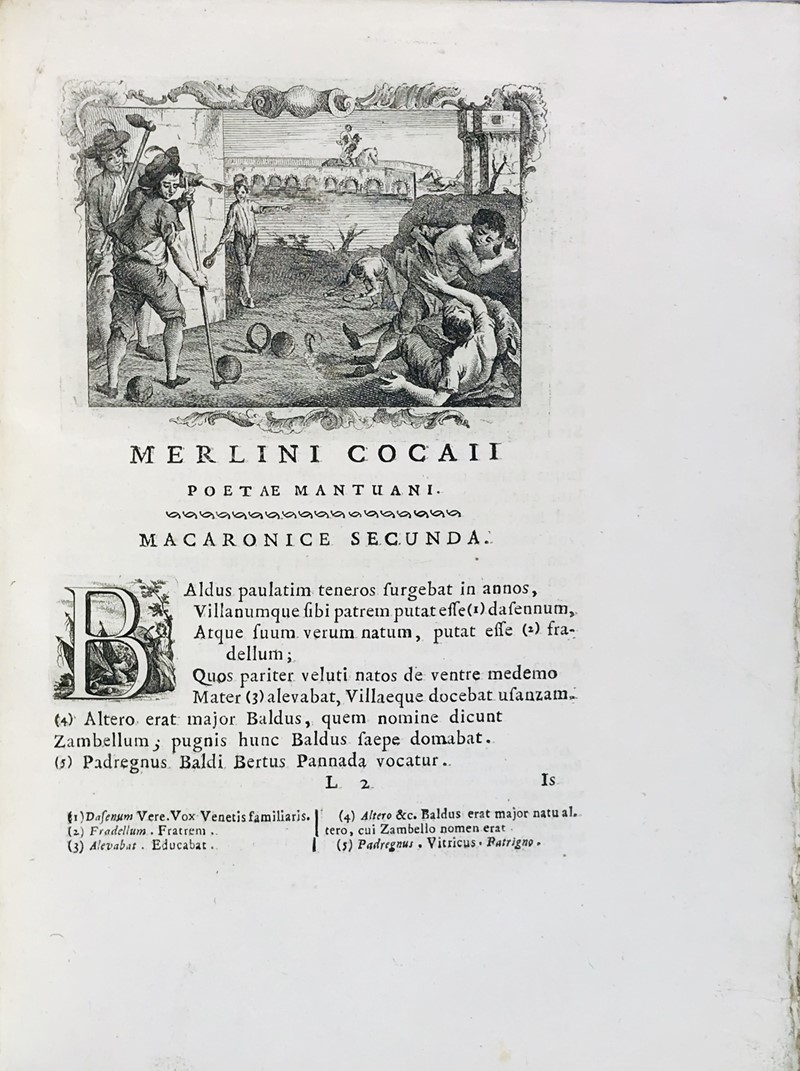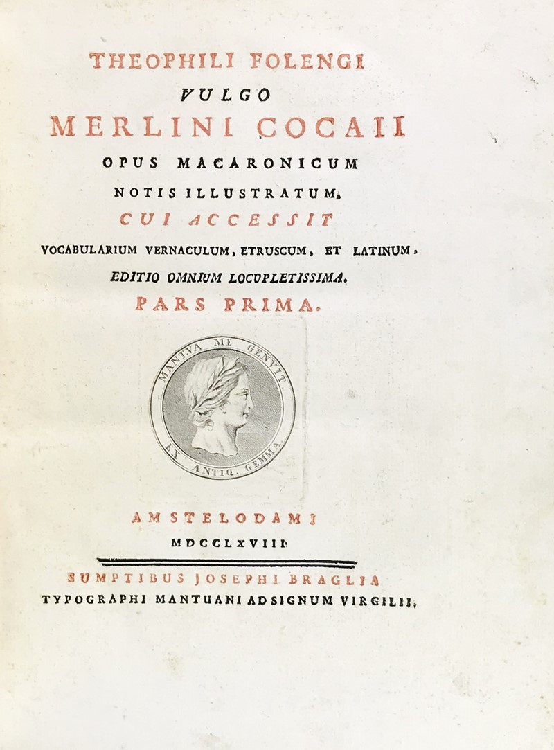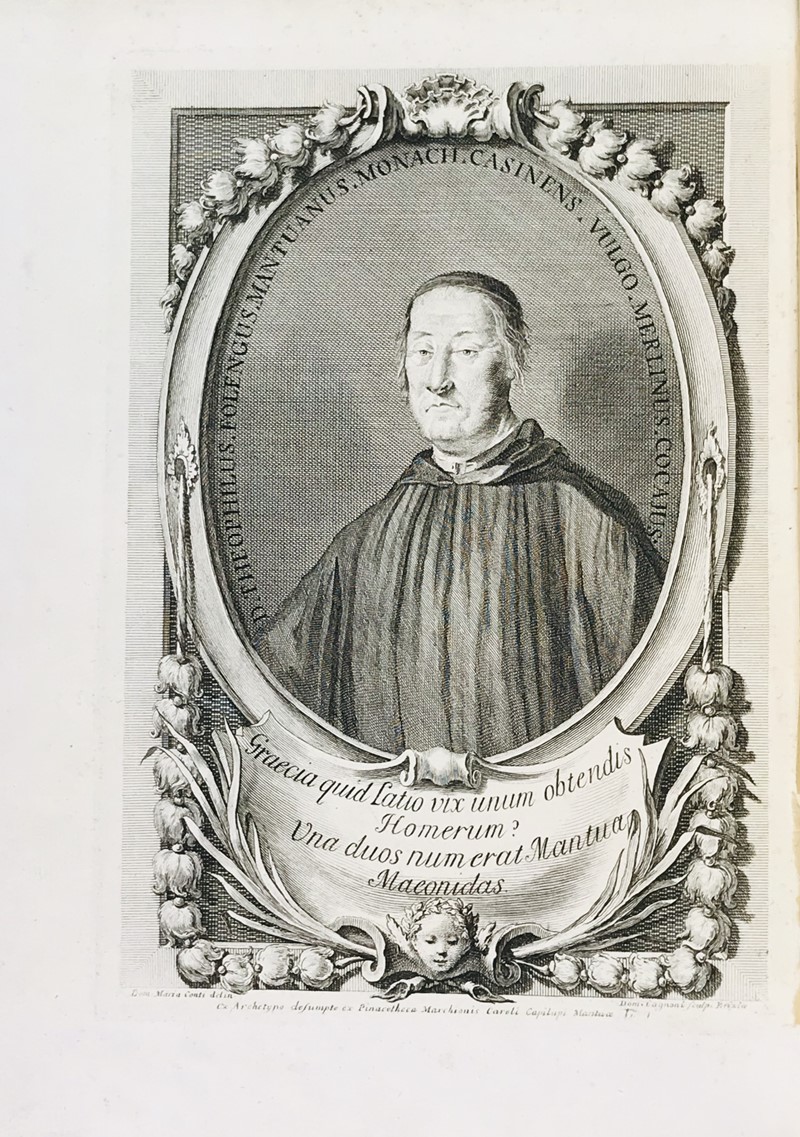 Rara edizione figurata, con il primo vocabolario mantovano-toscano latino. L’opera è impreziosita da 75 incisioni in rame nel testo, di gusto veneziano, una per ciascun argomento che precede i canti. Il primo volume si apre con una lunga notizia biografica sul Folengo, e dal catalogo delle sue opere. La più completa edizione delle opere di Folengo curata dall’abate mantovano Gaetano Teranza, stampata da Braglia a Mantova con falso luogo di stampa. Oltre all’Opus Macaronicum, la Zanitonella, la Moscheide e gli Epigrammi; alle pagine 371-411 del secondo volume, uscito nel 1771, il “Il Saggio d’un vocabolario mantovano” di G. Teranza. L'opera è preceduta da lunghe notizie biografiche sul Folengo e dal catalogo delle sue opere. Edizione stampata da Braglia a Mantova anche se con falso luogo di stampa