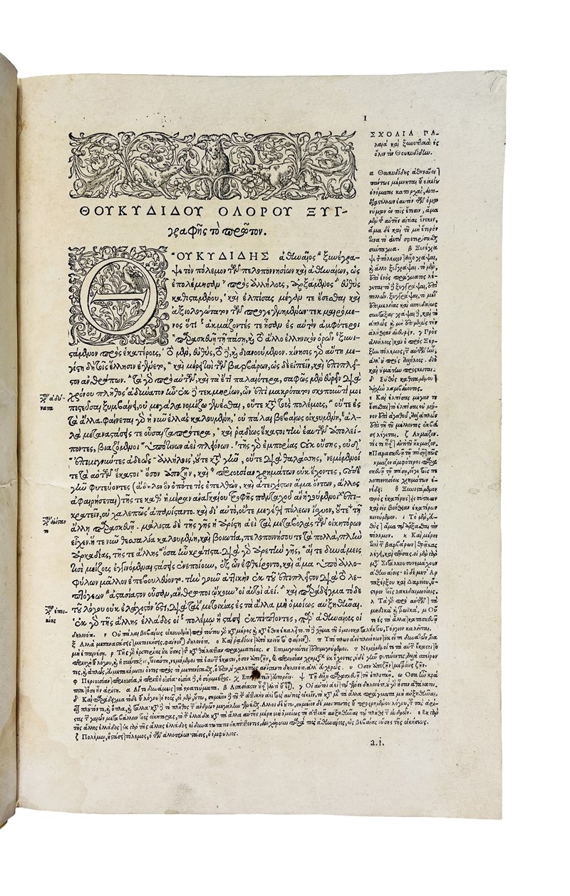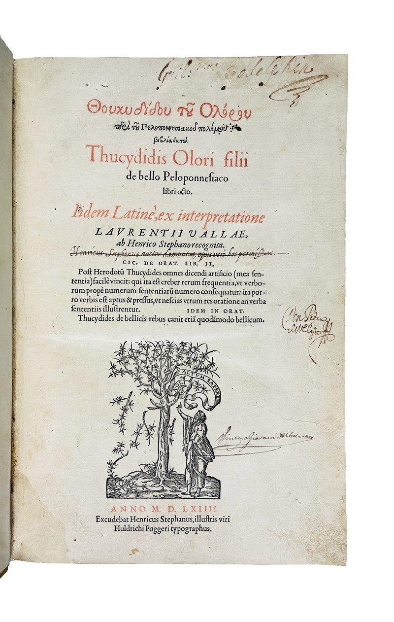 Prima edizione di Estienne con il testo greco accompagnato dalla traduzione latina, che, sebbene attribuita a Valla nel titolo, fu condotta principalmente da Estienne stesso, autore delle note. Henri, nipote di Henri il vecchio e figlio di Robert Estienne, fu uno dei maggiori umanisti francesi del XVI secolo, autore della monumentale opera Thesaurus Graece Linguae. Adams T-666; Renouard, Estienne, 152-153; Dibdin, 506; PMM 102: "The text was first printed by Aldus in 1502. The edition of Henri Estienne, a member of the famous French family of printers, who corresponded with scholars as an equal, first came out in 1564. The edition cited (the second edition, 1588) was improved by the addition of a translation into Latin by Lorenzo Valla..."