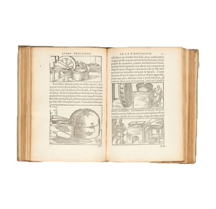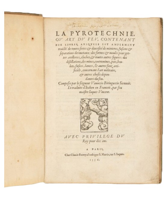 Rara prima edizione francese, opera riccamente figurata che illustra la tecnologia pratica del XVI secolo. Tradotta da Jacques Vincent de Crest-Arnauld contiene 84 figure impresse in xilografia nel testo. Suddivisa in dieci libri è la prima e più celebre opera sulla metallurgia e mineralogia, con riferimenti anche all'alchimia. Mieli: “Il trattato di Biringuccio si può qualificare come la prima opera organica relativa a tutto un gruppo di scienze applicate che sia stata pubblicata nel Rinascimento.” Hoover Coll. 129-30: "one of the classics in the history of science and technology". Duveen: “famous book on metallurgy and mining, containing interesting chapters on alchemy and illustrated by very fine woodcuts”. Norman: “The first comprehensive treatise on the pyrotechnic arts. … Virtually all of Biringuccio's descriptions are original, based upon first-hand information garnered during his various employments as a mine and forge operator, director of the Sienese mint, cannon caster and fortification builder, director of building construction at the Duomo, and head of the papal foundry and munitions works… Biringuccio's work is important to art history for its description of the Renaissance methods of casting medallions, statues and bells; and to the history of printing for containing the earliest known account of typecasting. His contributions to chemistry include the first account of silver amalgamation and liquation, the earliest mention of cobalt blue and manganese, and the first description of antimony, antedating that of Basil Valentine by fifty years.”