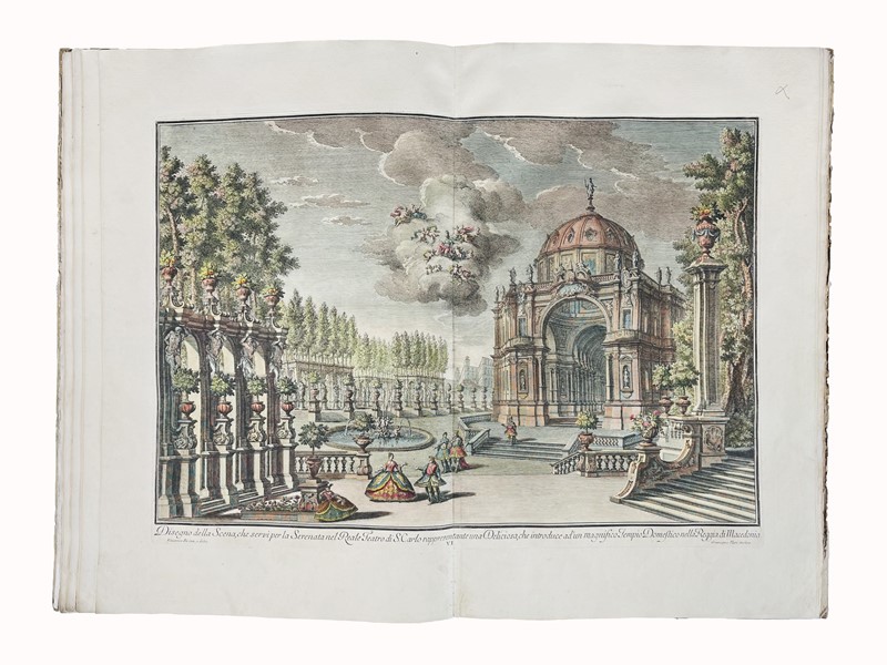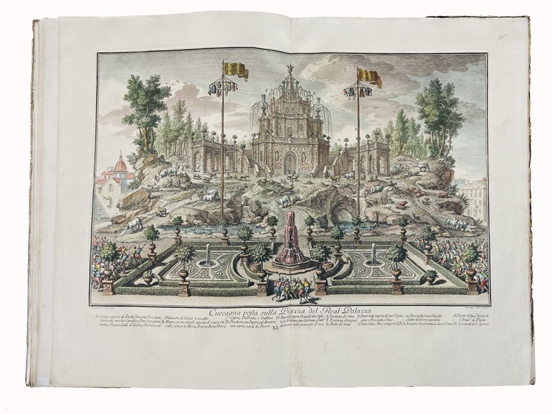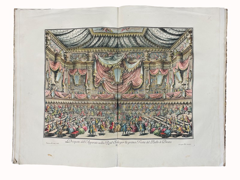 First edition of one of the finest festival books of the 18th century. The volume is illustrated with 15 beautiful plates (some colored), engraved by Giuseppe Vasi, Angelo Guiducci, Felice Polanzani, Nicolas Desjardins and Luigi Le Lorrain from drawings by Vincenzo dal Re, court architect and stage designer. The very rich iconographic apparatus in the volume reproduces the masked balls, banquets and settings, including the San Carlo theater, made to celebrate the birth of Philip, eldest son of the King of the Two Sicilies Charles of Bourbon. Of particular interest are the plates depicting the San Carlo theater, where on that occasion Il Sogno di Olimpia by Ranieri de' Calzabigi with music by Giuseppe De Majo was staged (Vinet 604). The last plates depict the land of Cuccagna and a large fireworks machine.