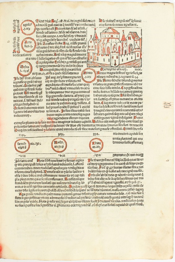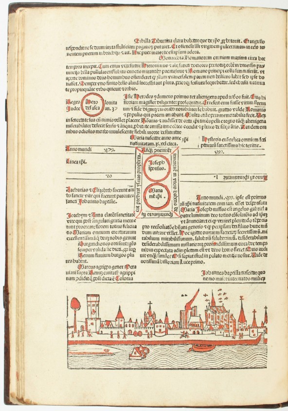 Rarissima edizione. Il Fasciculus temporum, pubblicato la prima volta a Colonia nel 1474, è stata la prima cronaca del mondo stampata e si proponeva di offrire ai lettori una panoramica completa della storia dell’umanità, dalla Creazione al 1474: la cronologia segue una doppia linea temporale, misurando il tempo sia dalla creazione che dalla nascita di Cristo, richiedendo un layout tipografico straordinariamente complesso. Relativamente a questa edizione BMC nota: “With woodcuts: the cut of Cologne n Quentell’s 1481 eddition recurs here, broken at one end. Guendenschaff’s cut of the Crucifixion also recurs,. The attribution of this book is uncertain … The supplement on 66a consists of a detailed account of the meeting of Charles Duke of Burgundy with the Emperor Frederidh an his son Maximilian at Trier in 1473 …” Fra le xilografie compaiono: L’Arca di Noè, La Torre di Babele, vedute di città fra cui Roma e Colonia.