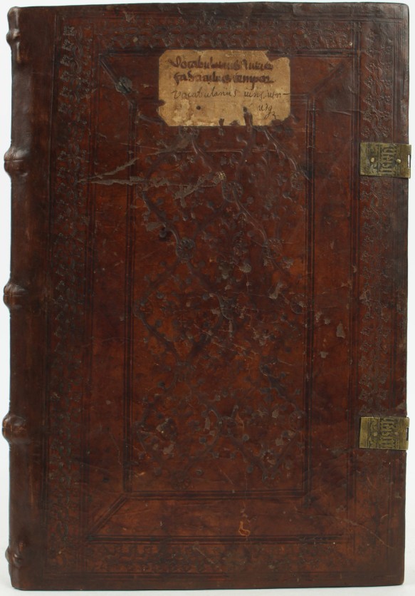 Folio. 315x210 mm. Legatura coeva in pelle con impressioni a secco su assi di legno, restaurata, dorso rinnovato, senza fermagli. 74 carte non numerate (la prima bianca). Segnatura: a-b8, c6, d8, e6, f8, g6, h8, i8, a8. Le ultime 8 carte, a8, contengono la ‘Tabula brevis’. Testo su tre colonne di 53 righe, spazi per le Iniziali, carattere gotico. Con 10 xilografie (1 ripetuta) e numerosi diagrammi a forma di cerchio, tutti colorati in rosso. Carattere gotico. Rubricato su tutto il testo. Marginalia di mano coeva su tutto il testo, in rosso e nero. Alcune macchie d'acqua marginali, più evidenti alla fine; fori di tarlo marginali in alcuni punti, piccolo strappo marginale su una carta. Bell’esemplare con ampi margini, rubricato su tutto il testo.