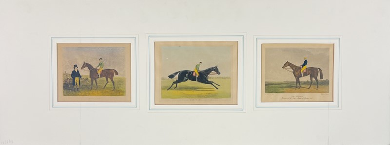 Fine plates depicting English horses with the name of each animal at the bottom. The plates depict the quadrupeds both alone and surmounted by jockeys at competitive races and competitions. The plates are engraved by several English engravers of the period.