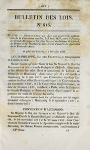 France, Lubeck, Bremen and Hamburg, against trafficking. Louis-Philippe I, king of the French. Bullettin des Lois. N. 616. Ordonnance du Roi qui prescrit la publication de la Convention conclue, le 9 Juin 1837, entre la France, la Grande-Bretagne et les villes libres et anseatiques de Lubeck, de Breme et de Hambourg, dans le but d’assurer la repression de la Traite des Noirs, 1838