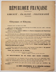 Liberation of the Lower Seine. Le Comité Départemental De La Libération Nationale de la Seine-Inférieure. «Citoyennes et Citoyens. L'ennemi est chassé de la Ville»